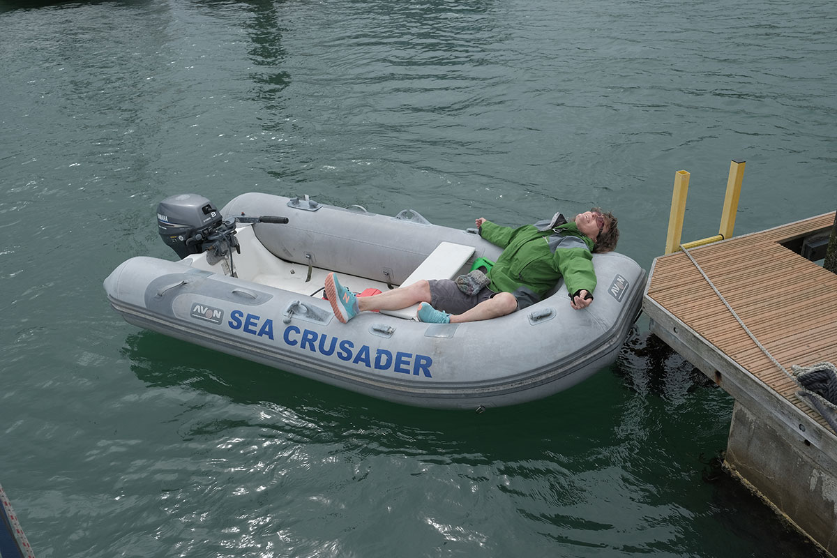The harbour master had given us a tip and had suggested that we could go up river with the tide to a pub and have a quick lunch so this morning I called the pub and the lady said they were fully booked but not to worry as they had 22 outside tables so it would not be a problem. Graham and Ginny left first in their new dinghy, we had the benefit of a rib so we could go a lot faster then them. Off we set and it turned out to be a lot further than we expected and on the way up to the Crabshell Inn at Kingsbridge the water open out to the west and at this point we were really exposed to the wind and we really did get wet. We arrived and struggled to find anywhere to tie up we were directed to a sheer wall which was a bit of a game.