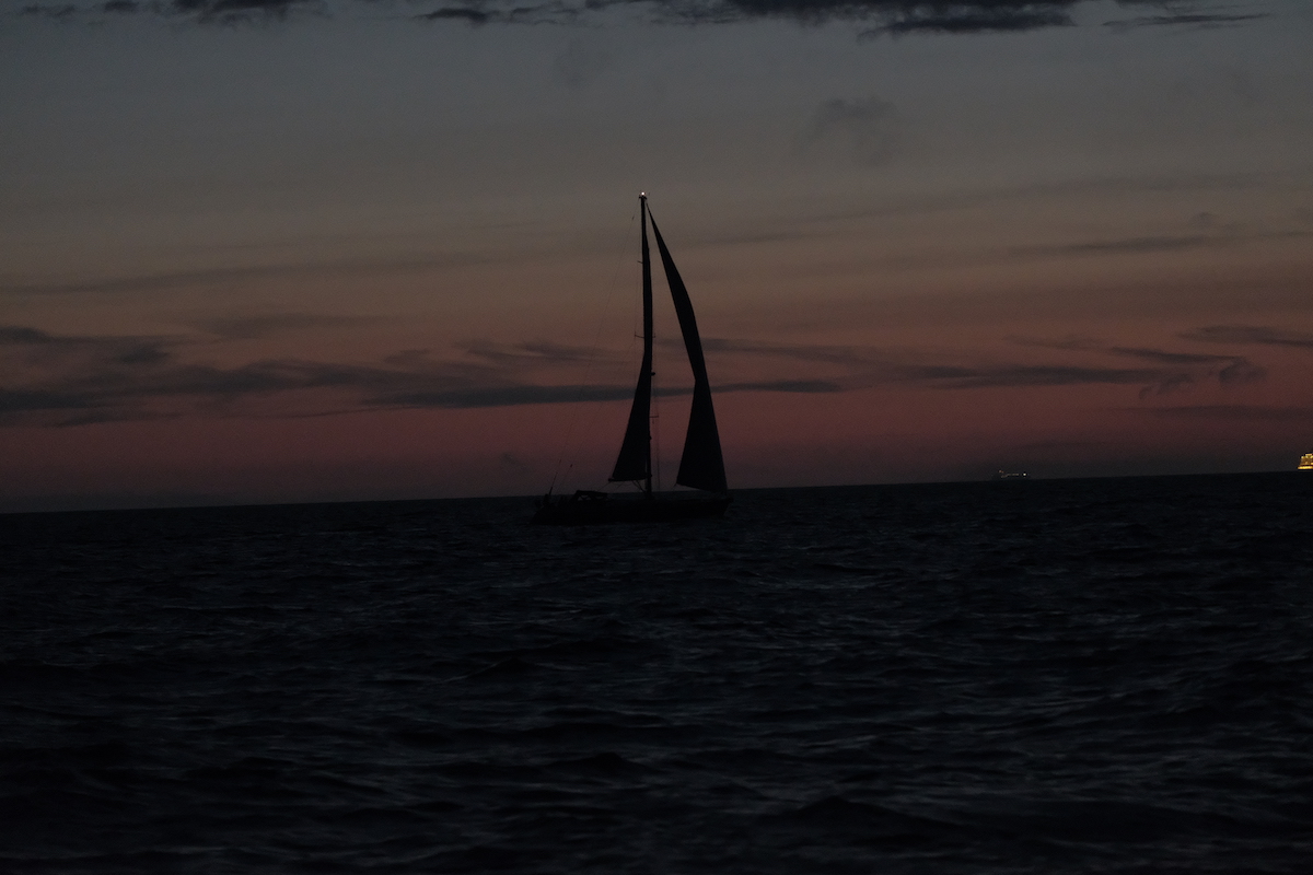 The entrance was quite lumpy but it didn't bother Sea Crusader at all and the winds were around 15knts so the going was good. As the evening drew on the wind completely dropped and so we set about putting up the spinnaker and untangling it. It went up perfectly but Mark's assessment was not good, I have some modifications to do. At around 11pm the steering went again and the boat did a little pirouette whilst I replaced the bolt once again. After that was fixed we rolled it away and concentrated on getting the boat moving. Needless so say the wind picked up and moved forward (Sea Crusaders best point of sail) slowly we over took every boat bar one that had left really early, but we were just two minutes behind them in the end. We stormed at about 1.2knts faster than everyone else.