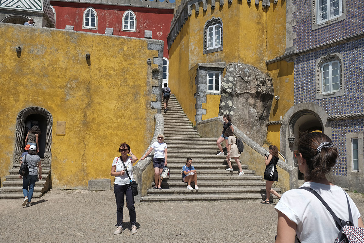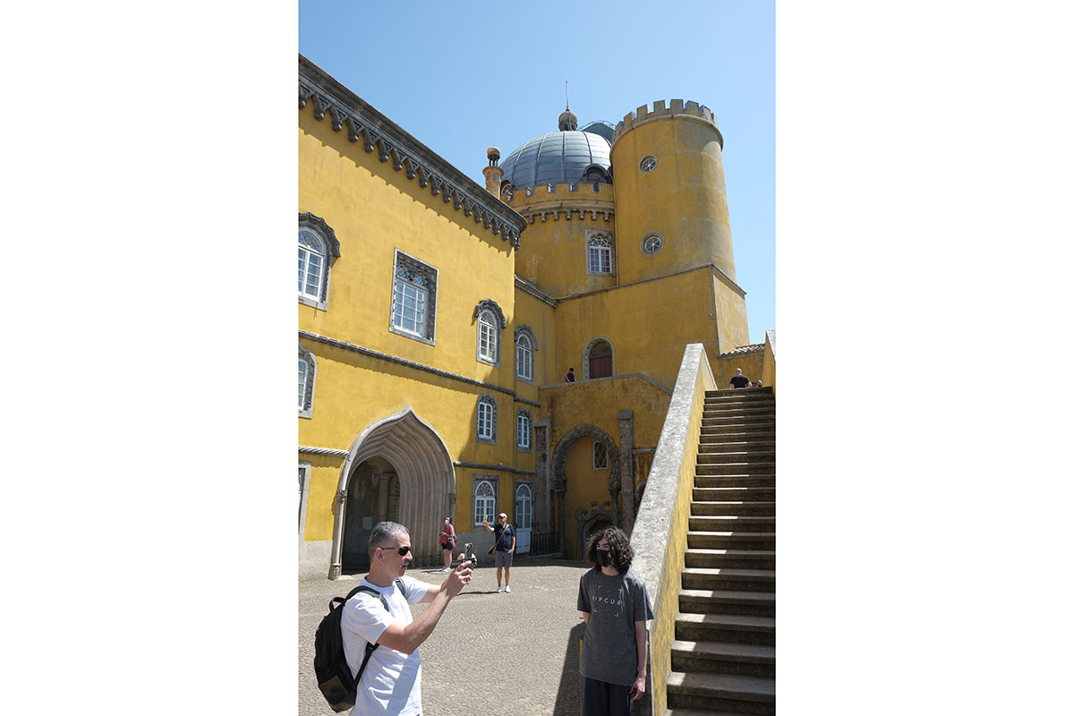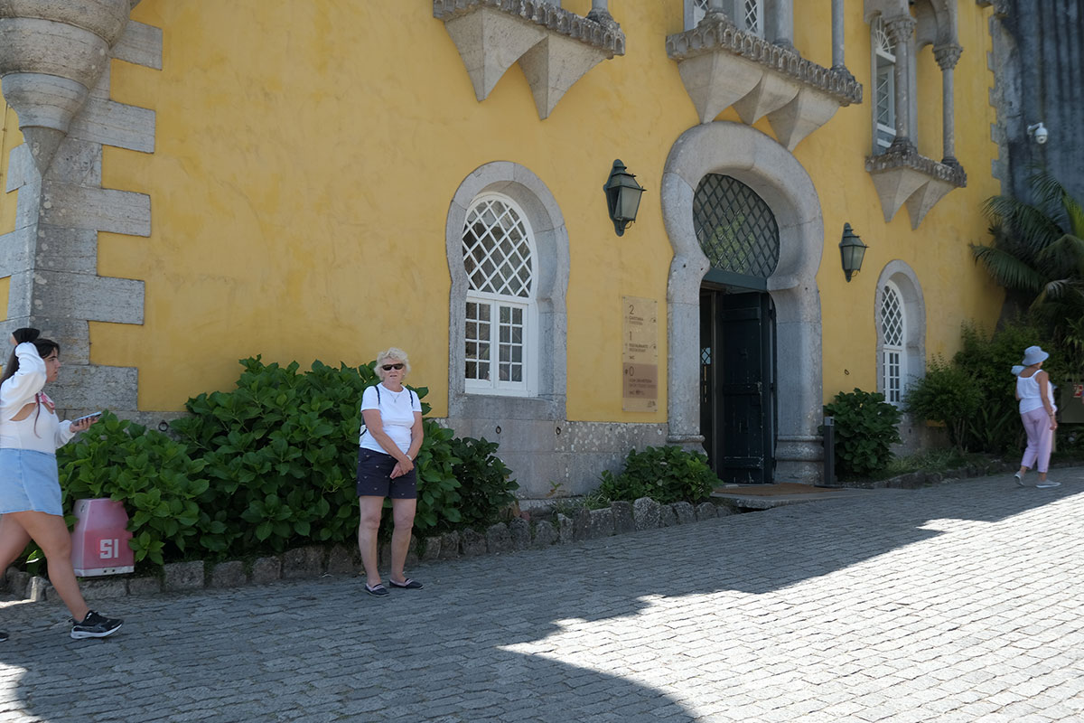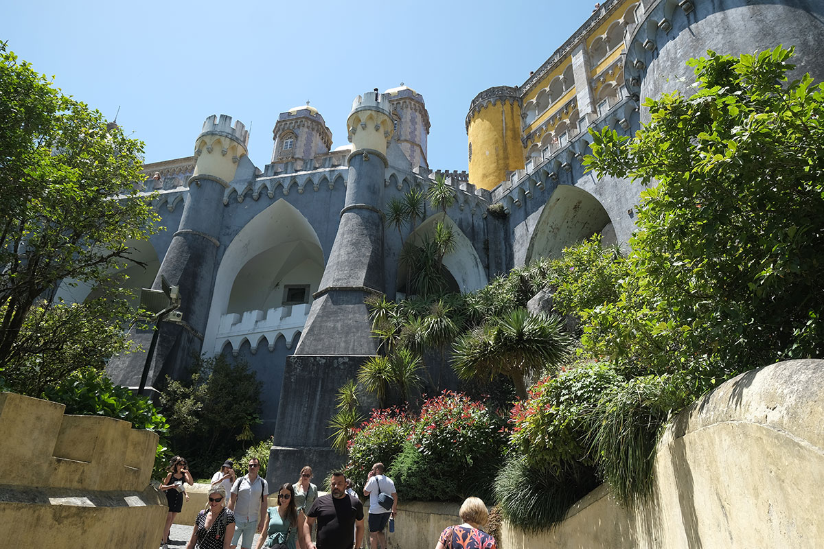 Our stop in Lisbon was simply not long enough there was so much to see and only having one free day was simply not enough. We got back in the TukTuk and up the hill we went and finally we arrived at the Palace. We had to choose our entry time to get inside the Palace and since it was now two PM we decided that 3:30 was best then we could get something to eat. From the entrance to the Palace is a climb of around 500m so we went straight to the cafe, it was closed. We then walked up the path and there was a picnic area with a booth selling sandwiches but there was a restaurant higher up which Linda preferred so we continued walking. When we reached the palace there was a restaurant on the first floor and a cafe in the roof. When we reached the first floor there was a big queue and Linda joined the end of it. I went in to scout out the food. Well it was worse than motorway food, curried pasta or dried our slices of meat with rice - no thanks. We proceeded to the first floor and again queued up only to find that they had run out of sandwiches. Linda nearly had a sense of humour failure at this point. So I said I would go back down tot he picnic area buy the sandwiches there and she should queue up for some iced tea and I would be back soon. When I returned I was inundated by people wanting to know how we had got sandwiches. Needless to say Linda was a lot happier now.