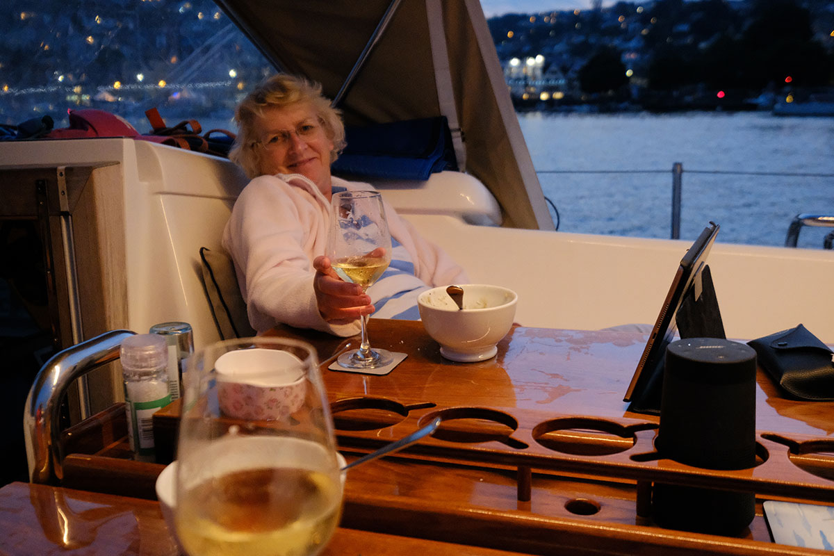 We arrived in Dartmouth and called the Harbour Master for a berth and he allocated us a mooring between two big yellow buoys. So we opened a bottle of Rose. We then called Susan and invited them for dinner and they are coming tomorrow evening.