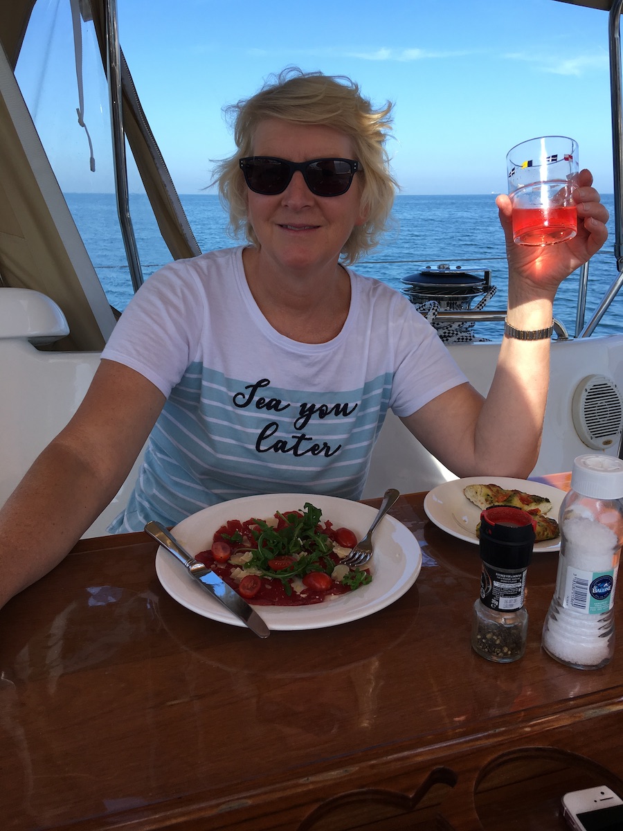 At 3:30 she awoke me as it was time to re-cross the shipping lanes and I was amazed to find that we had three ships behind us and as soon as they were past we were completely free to cross with nothing in sight. Such a difference to the other end! Linda stayed up with me for this bit and we were soon able to pull out some sail. As dawn broke and we were ten miles from the Kiel entrance we were able to hoist our cruising chute (Spinnaker) and had a lively sail into the estuary. Once in the estuary we doused the sail and pulled out the genoa. We calmly sailing up the estuary until we ran out of wind. When we passed Laboe we decided that we would rather go there than the marina we were booked into. So I picked up my phone and there was a message from Jolief that they were going to join us at our original marina, so when they arrived I took their lines once again for the third time, Gwyn wanted to award me a yellow shirt.