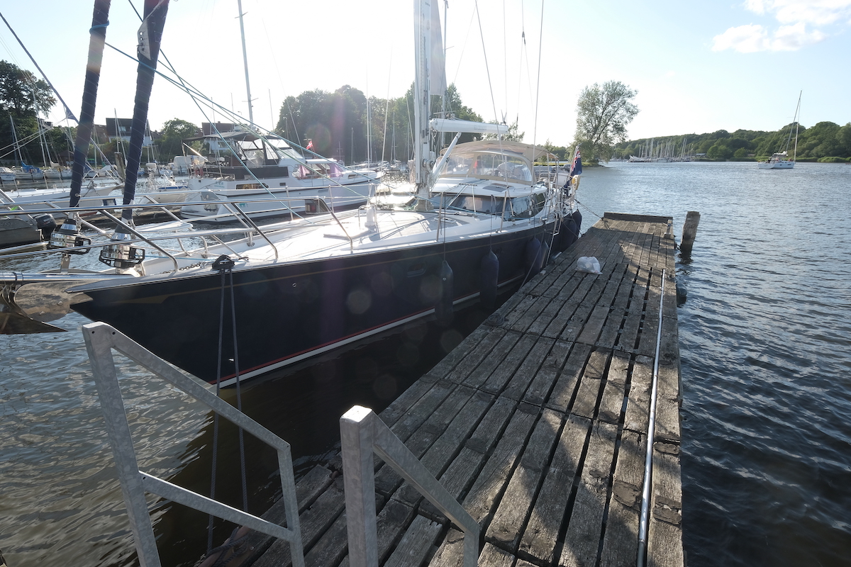Once through the lock we had about 40 miles to go to get to Rensburg. The ships in the canal are simply awe-inspiring, to see such large ships inland is really strange. We reached Rensburg and found a lovely marina but we were sure that the post on the boxes were set 4.5m apart and we are 4.7m wide, not wishing to get stuck, nor to damage my boat I declined. "The big boats go around the back" a woman shouted at us from another boat, but when we took a look it was impossible the piles for the dock were n the outside, you needed space hopper sized and shaped fenders which I didn't have. After spending 30 minutes trying to find a space we headed out, when I spotted a small boat yard on the left with a one empty creaking wooden dock(It had to be seen to be believed). I proceeded with caution, I don't think Graham could bear to look as we only had 0.9m under the keel.