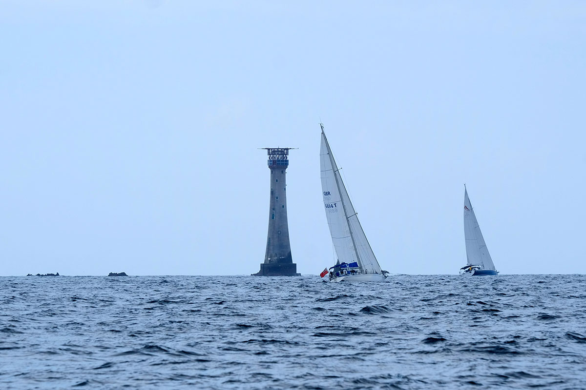 As we got further out the tide was taking us all towards the Eddystone Lighthouse and we had to choose to head up and leave it to port or bare away and sail a little faster but in the wrong direction. Most boats left the Eddystone to starboard, we went to port. for the first 24 hours there was clearly a leading pack and approaching Ushant boats had to choose again to either go outside the shipping lanes or take the short cut go inside, cut the corner and then have to cross the shipping lanes again at the other side. We elected to go outside, this meant no mucking about with ships in the middle of the first night. As we approached it was clear that we were still in third of fourth place. It soon became apparent that those that went outside had a clear advantage with both winds and tides and Sea Crusader took the lead.