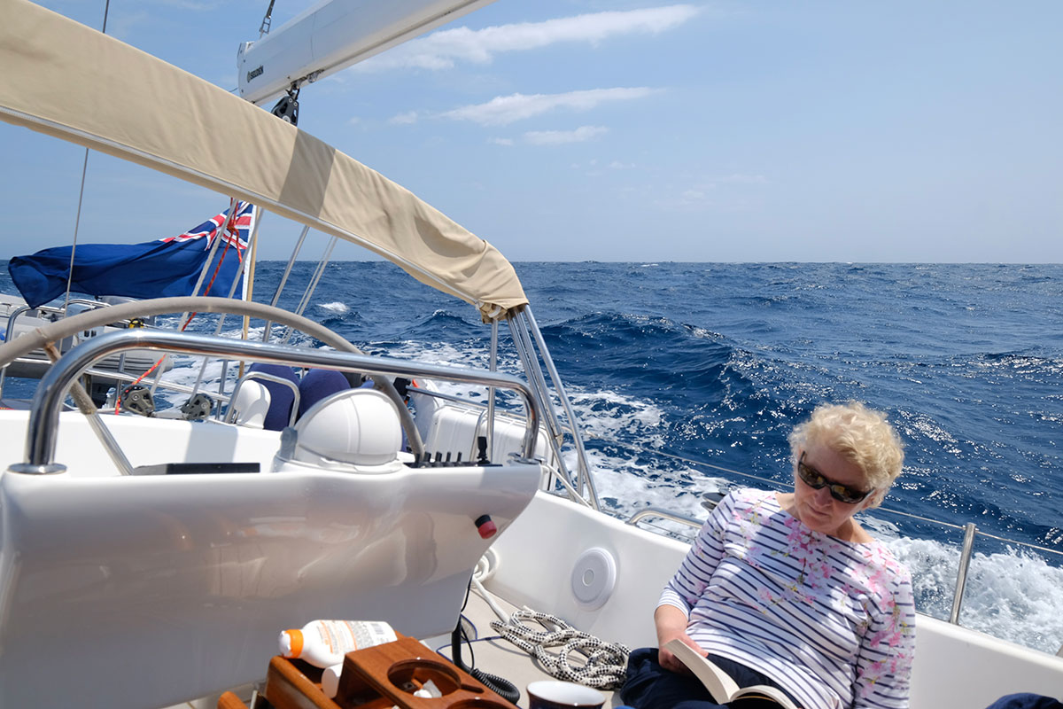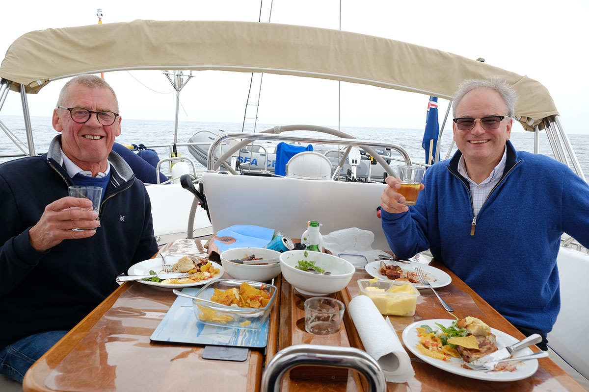 As day two progressed the winds became more established behind us and I decided to pole out the genoa which was a brilliant move. With the genoa fixed in position the winds built up and we just went faster and faster. As dusk approached I decided to put the main sail away as if with winds increased it is a difficult sail to furl. This was interesting as we were then able to steer the correct course.