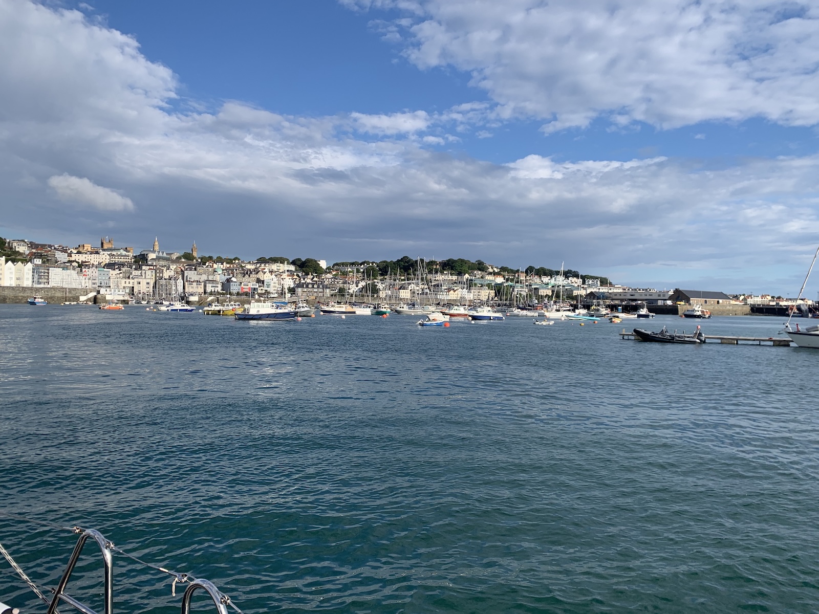 The tide started running South at about 2am and neither of us wanted to go at that time given our late arrival in Alderney but 4am was ok as it meant we would arrive in Guernsey around 8am and we could chill out. The photograph on this page shows what it was like to set off but within 5-10 minutes it was really light as the sun rises as fast as it sets. Soon we were heading down the notorious Swinge, this is a passage between Alderney and a small cluster of its Islands where the tide rushes through and the water is often quite turbulent. Once safely through we were on our way South. It wasn't the most exciting sail to Guernsey but with big tides taking us we just enjoyed the ride.