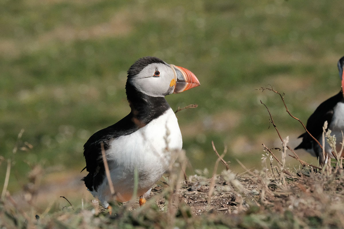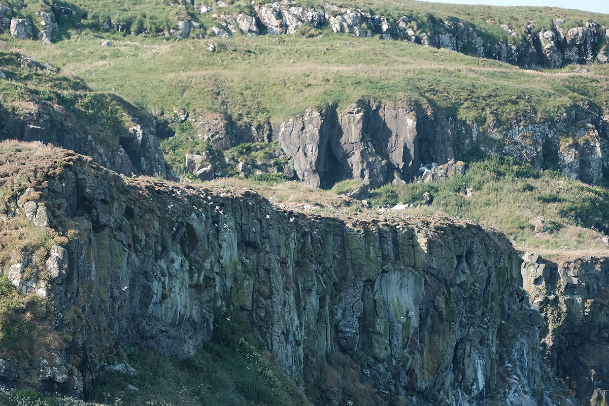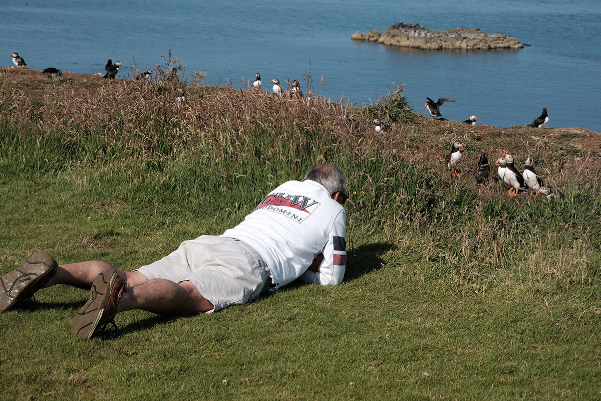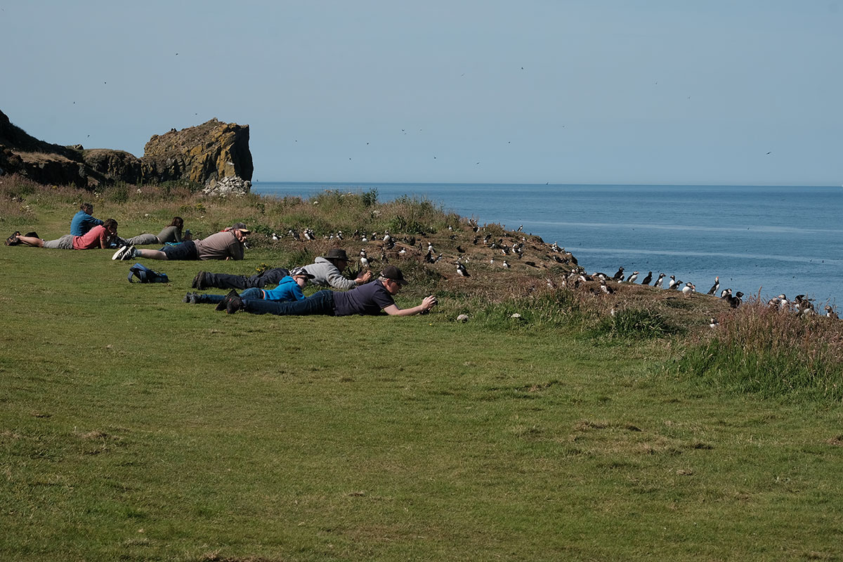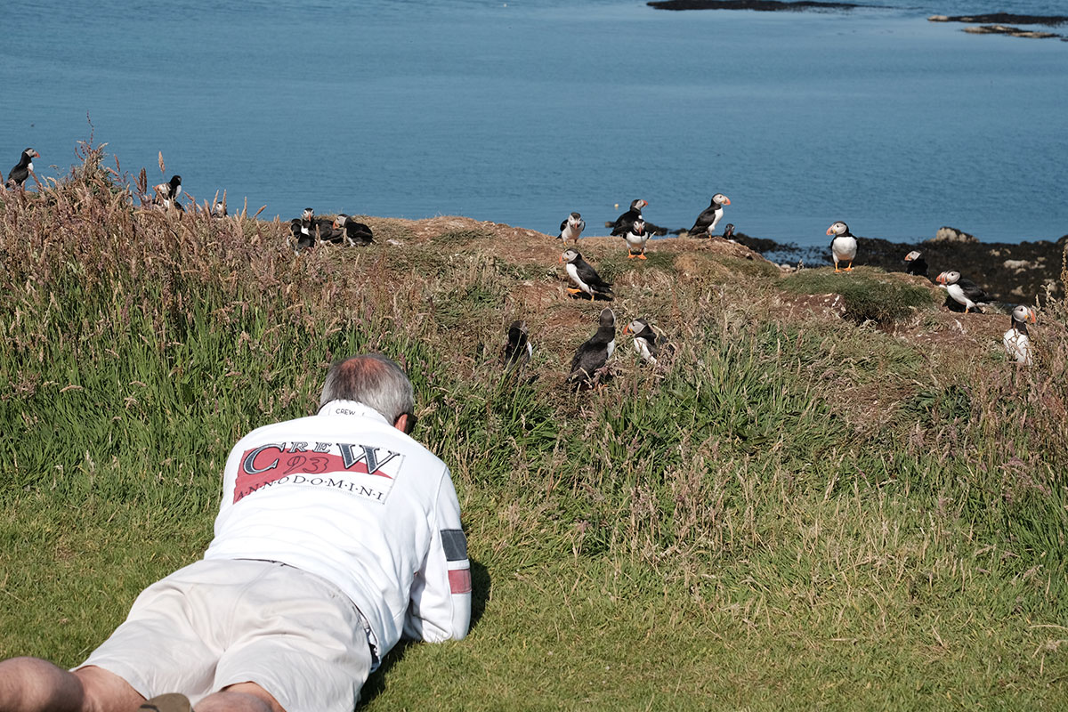 After breakfast we launched the dinghy and went ashore. I connected a long line because I could see that the tide was falling and I didn't want our dinghy beached on rocks as it is far too heavy for us to lift (A lighter dinghy is on the wish list). We walked up the hill to the place where we could see the puffins taking off from. Well what we saw next was something I would never have expected, hundreds of tame puffins all on the cliff top happy for humans to approach. They were swooping down to the sea and back to the cliff edge where some were busy digging burrows. What the photo's don't show is the smell, I am not sure if the smell comes from poop or is just the animal smell. What I can only tell you is that it was simply outstanding, the best thing we have done on this holiday by far.