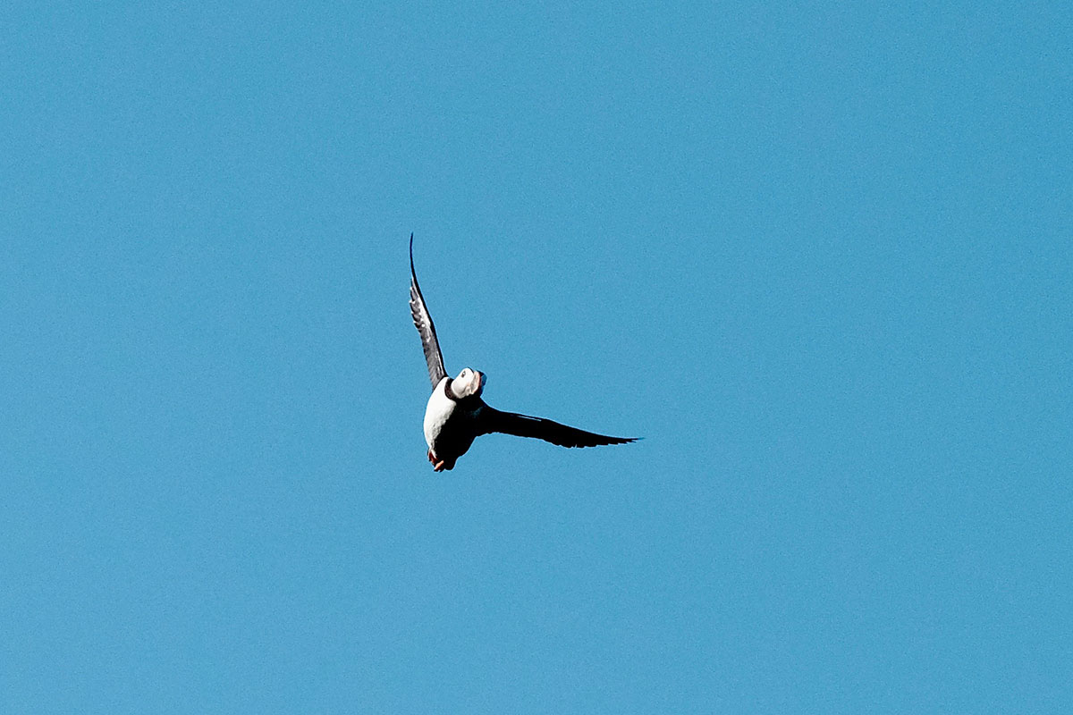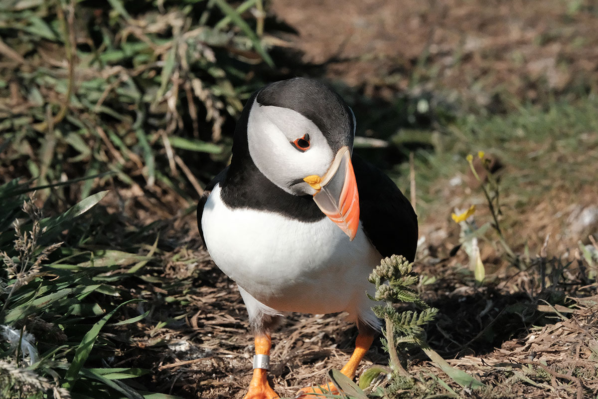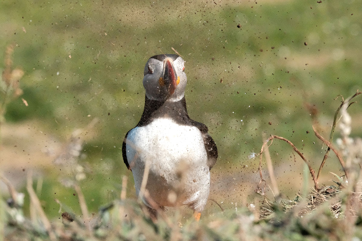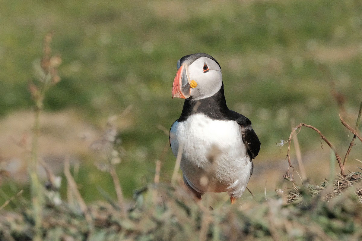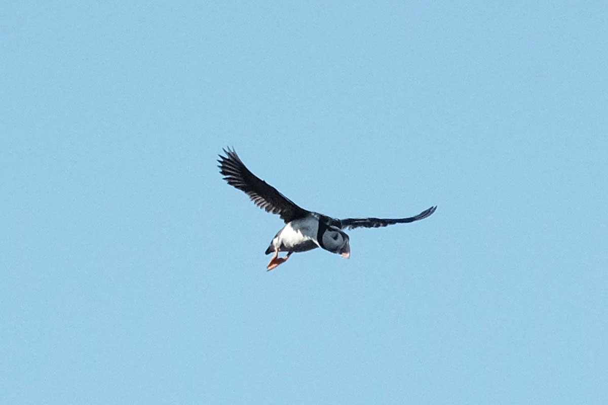 After breakfast we launched the dinghy and went ashore. I connected a long line because I could see that the tide was falling and I didn't want our dinghy beached on rocks as it is far too heavy for us to lift (A lighter dinghy is on the wish list). We walked up the hill to the place where we could see the puffins taking off from. Well what we saw next was something I would never have expected, hundreds of tame puffins all on the cliff top happy for humans to approach. They were swooping down to the sea and back to the cliff edge where some were busy digging burrows. What the photo's don't show is the smell, I am not sure if the smell comes from poop or is just the animal smell. What I can only tell you is that it was simply outstanding, the best thing we have done on this holiday by far.