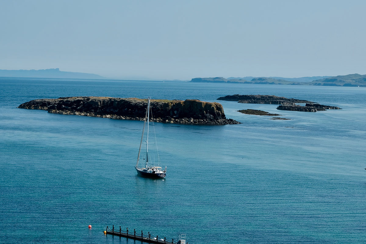 These small islands are about 7 miles west of Ulva on the route to Coll and have a reputation for both seals and puffins. It was too early in the morning for there to be any wind for sailing and what wind there was, was coming directly from our direction of travel so we motored and made some hot water. When we arrived we found a great spot to anchor amongst three other boats.