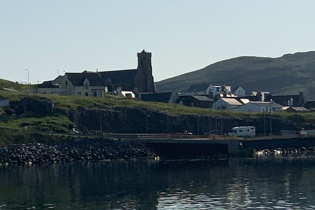 After visiting the distillery and Co-op Linda tried to go back to the general store but it had a note saying that it was closed for 20 minutes to watch the funeral procession. We walked back to the boat and were amazed to see that there were about 100 cars following the hearse. I should think that almost all the permanent residents were attending.