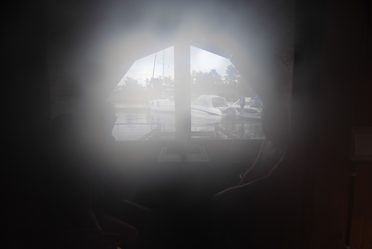 The marina/restaurant has a barrel sauna in the harbour. With an access ladder into the sea. We booked it and this time we all went in together as this was a costume on sauna. After the first sauna Richard was the first to plunge into the sea closely followed by none-to-keen Charlotte. Then the whale flopped in and finally (drum roll) Linda! yes she did it, she did it, she did it, she positively did it.