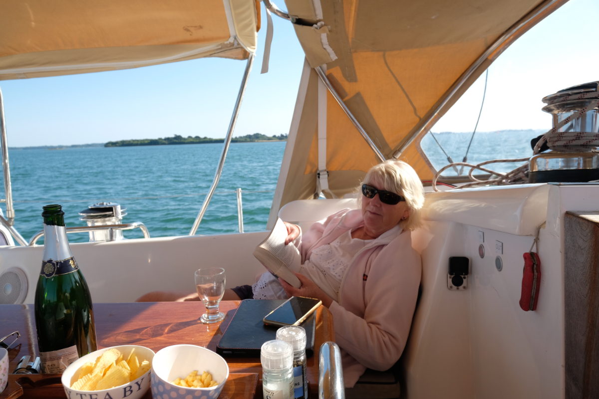 The next day the weather was grey and miserable, we realised we should have gone to the beach yesterday and done the jobs on this day. We walked into town and had lunch at a quayside restaurant. We ordered a bottle of wine which raised the waiters eyes (are they allowed to judge us?). After lunch we went on our merry way back to the boat and as we did the skies cleared and wind dropped and so we decided we would go one of the small beaches near the marina.