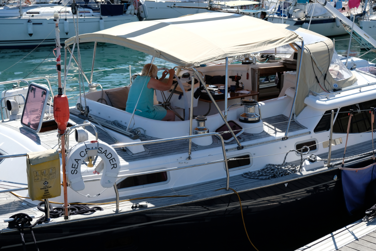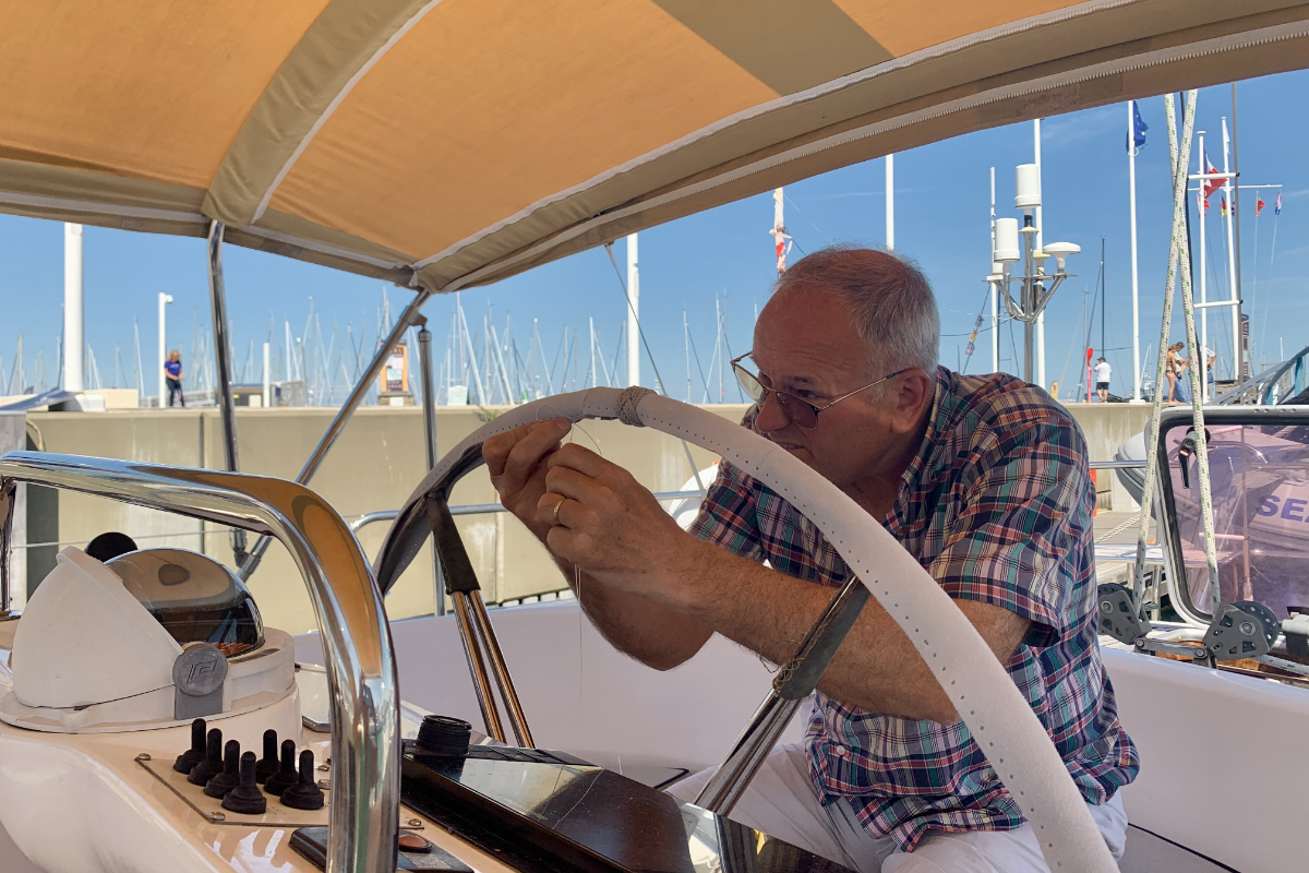 The next day it was lovely and I said to Linda would you like to stay a third day she jumped almost with joy, Linda loves Quiberon… there is one condition I said we have to recover the steering wheel. So we spent the day fixing things we took turns to recover the wheel, it took more than four hours of sewing to do it. It looks great now but we made a few mistakes and honestly I would like to do it all again but I am not sure I have an other 4 hours to spare. Once you start you can't move the boat until you are finished so if we did this in the Hamble it is a lot of effort and effectively a day out of a weekend. We will probably live with it. The day was really productive, I cleaned the windows with some professional window cleaner that JR gave to us, it was so got I decided to clean the windows inside… one spray and I nearly choked, my nostrils eyes and throat we all attacked, this was clearly good stuff but only for external use! (In my own defence the instructions were in every European language except English!).