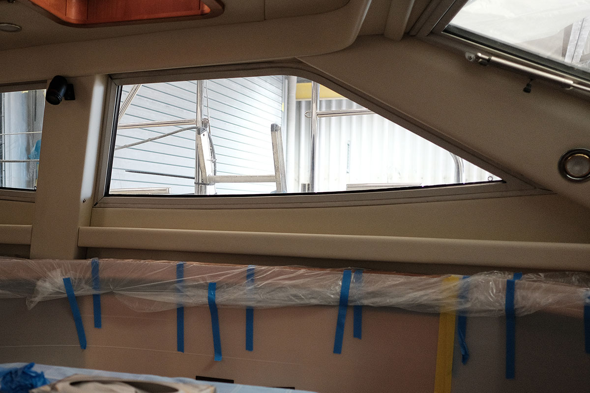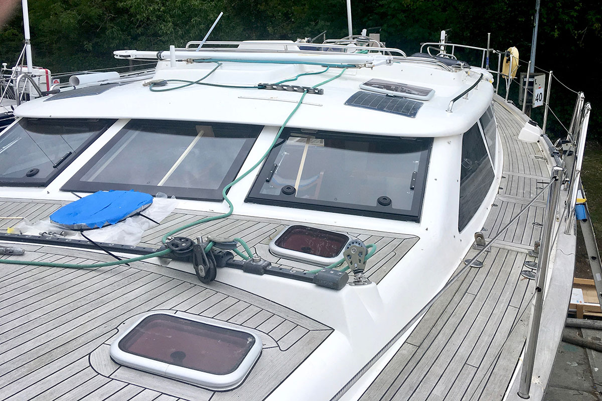 In January Linda and I went to the Dusseldorf boat show and for any one who has not been I thoroughly recommend it. It is all inside but 100% yachting ands every boat you have heard of and many you have not will be there. Together with halls devoted to bits. Whist walking through whom should we meet Houdini. I only stopped because I wanted some better flush mounted windows on my deck and they seemed to have some and I may order them. Whilst we were talking them I lamented the saloon windows and Houdini told us that they have a new range of "Invisiline" windows and they thought that they could make some. So I booked an appointment and as soon as the show was over they arrived in Hamble with a laser scanner and the deal was done. We were to be the first boat with the new windows and now I needed someone to fit them. There are a number of yards that could do the work but ultimately I decided to go to Desty's at Hamble point. They had a brilliant foreman for want of a better word and it was a leap of faith. We agreed that the work would be charged on an hourly basis and I went there on the first day to see how the old windows would release from the hull, some early boats had their windows stuck in with Sikaflex but we were lucky because by the time out boat had been made they had changed to a different compounds and they just pushed out making the change easy.