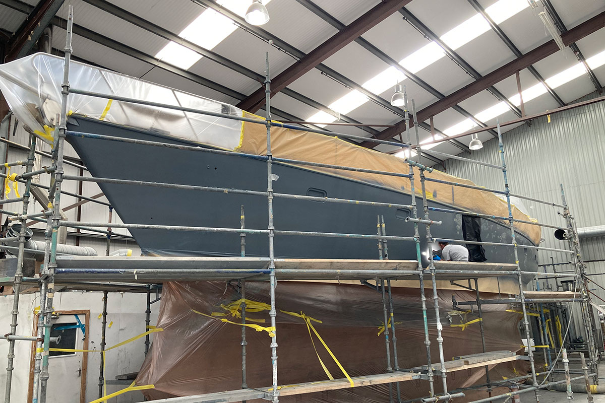 The boat was lifted and jetted of and then taken in the yard to Desty's to get the work done. Unfortunately the Copper-coating from the previous year has what I can only describe as the measles. We had a surveyor look at the work and he concluded that the original owners had had the boat epoxied and it had been under catalysed and that it was our responsibility to pay for it. It was a financial disaster because they had to grind the hull back to original gell coat add gel shield and then copper-coat again. In for a penny in for a pound we decided to paint the hull at the same time. The traditional choice is Allcraft 2000 or Algrip. Allcraft 2000 is repairable but very soft and we had it on Diamond blue and it was awful it used to rub off on anything. Algrip is so had it cannot be repaired. Luckily for us Algrip have a new paint out called HDT with is super shiny has a clear-coat on top and can be repaired. We also decided to modernise the appearance and smarten the boat up with silver boot stripe and what a splendid change it has made.