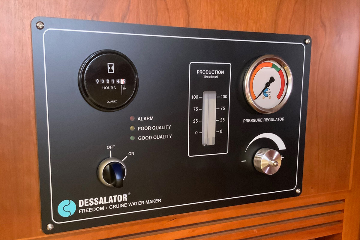 The Desolator D100 is a 100l per hour 24V water maker which could not be easier to operate you simply turn the on knob to make water. We were very lucky as Advanced Yacht (UK distributor for Desalator) appointed Toby Hague of Keto Marine to do the install and all I can say is what a fantastic job he has done I am so pleased with his work and would throughly recommend him.