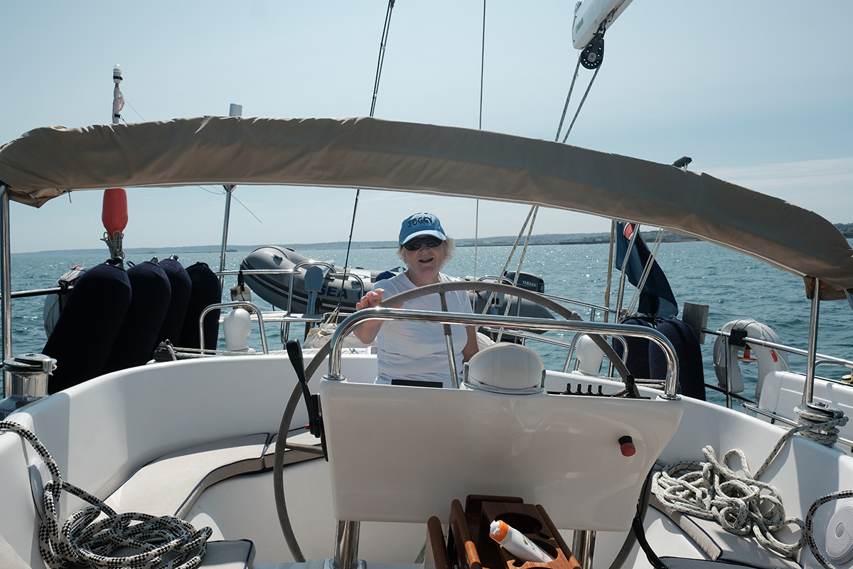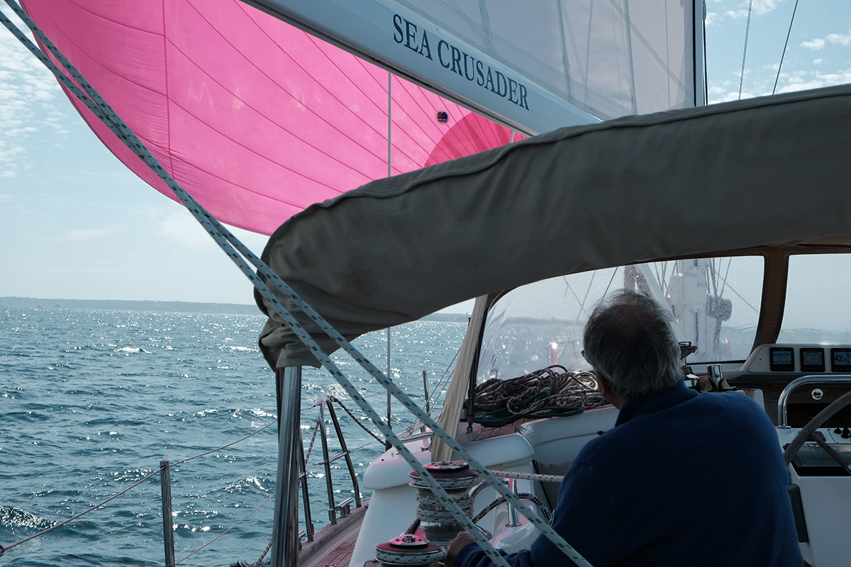 We ghosted out of the harbour western entrance at seven knots in about none knots of wind it was magical. the sea was so smooth the boat just glided along. There were several boats ahead and it was our job to catch them up and over take!… It was not quite so easy once we left the harbour as the sea was not quite so settled and so our progress was moderated, however that affected the other boats as well. Slowly we reeled them in but one boat took ages to catch and it was only when we got really close that we say they had their engine on! As we reached Cap De La Hague we found that we could not sail the wind dropped and we had to motor, we motored for about ten minutes. The reason the wind had dropped was a typical indicator of a wind shift and that is what we had. Soon we hoisted the spinnaker and we were off again. Unfortunately when I lifted the spinnaker I felt my abdomen go and… I now sure I have a hernia.