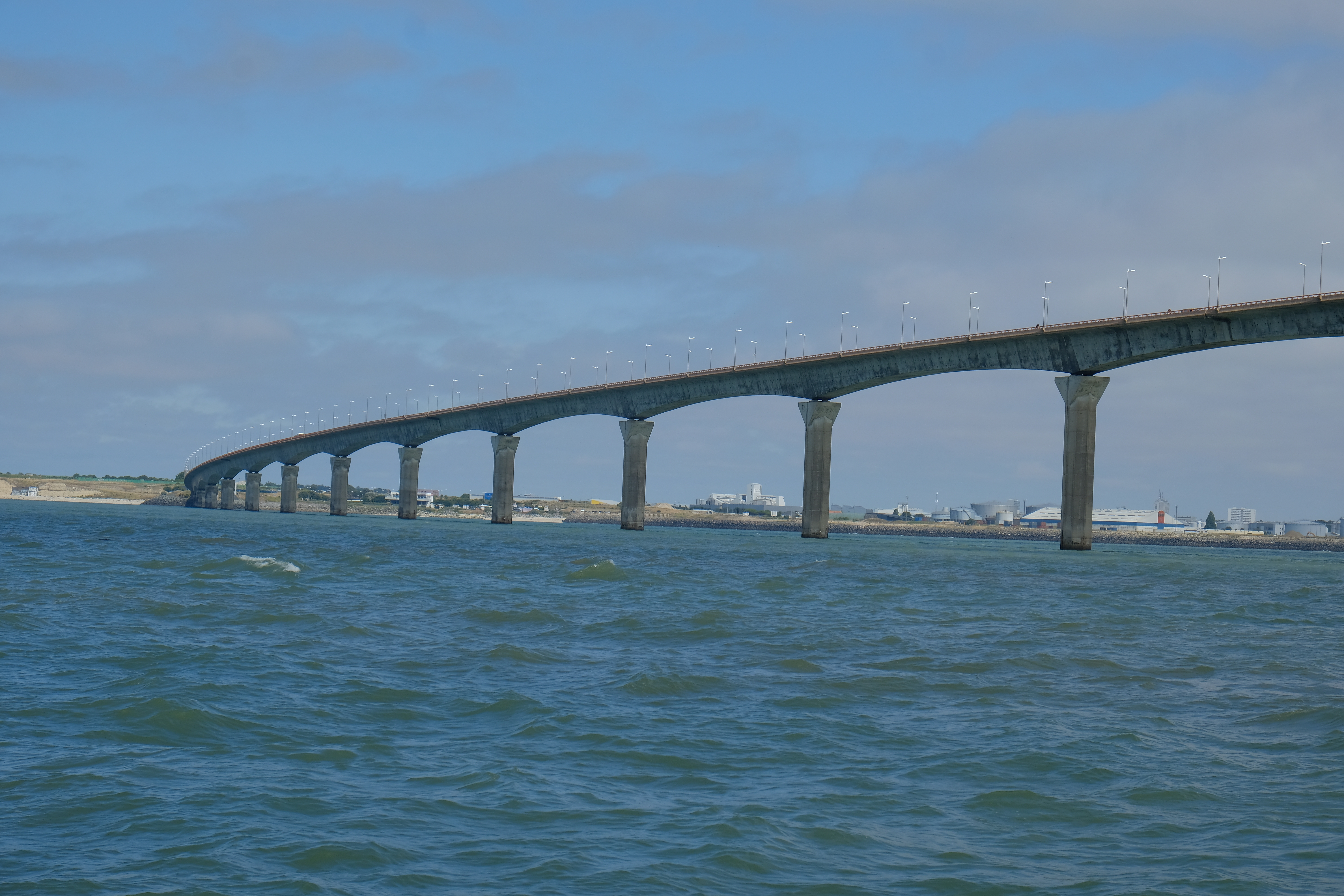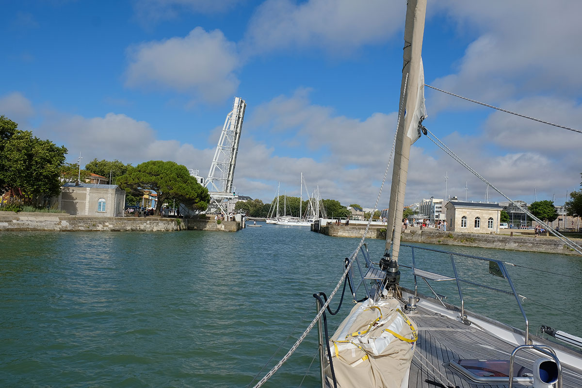 There wasn't a lot of wind but it didn't matter because we wanted to get into the inner basin and they only open the swing bridge around high tide so a slow journey was planned. As it happened we had little choice as there was barely 6knts of wind but it was just behind the beam and that means… the pink sail. We carried the pink sail for 6 ½ hours and averaged about 4.8 knots, it was not the most exciting sail but nevertheless were on for the 4:30 bridge opening, First we had to sail between Ile de Re and under the bridge. The bridge has a clearance of 30m so we should be well under that as we are about 24.5m including aerials.