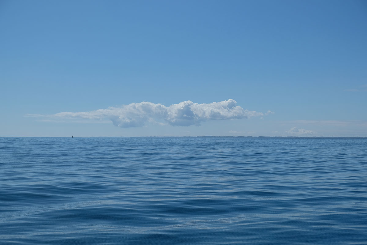 We cast off and it was quite serene and no wind, this was the first time we had been forced to really motor. The sea was smooth and the sky had wispy cloud. As we approached Belle Ile we noticed a cloud hanging over it. This is something that yachtsmen see all the time, that it will be a clear sky at sea and cloud over land. In times past sailors use to be able to forecast the position of land by looking for clouds. I took a great photo of it and it illustrates the phenomenon.
