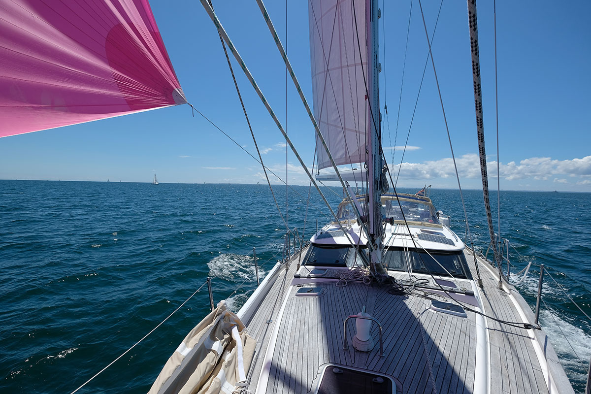 All was not lost because as we approached the Quiberon peninsular, the wind filled in and as we made the turn to run into La Trinite the pink sail was deployed and what a scream, it was the perfect end to a long trip.